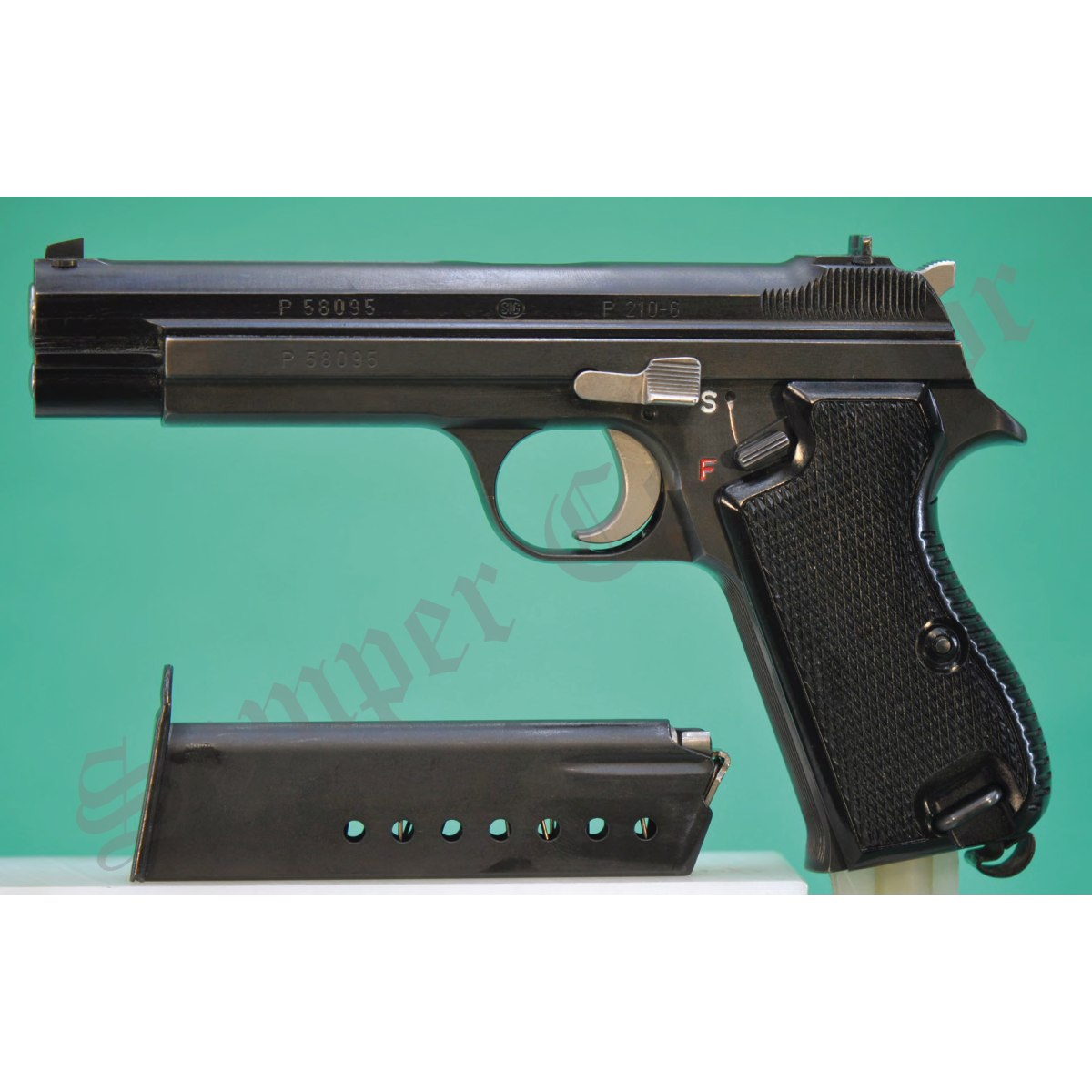 - wie auf Seite 80 von „H.P.Doebeli Die SIG Pistolen“ die SIG-Pistole P210-6 Kaliber 7,65 mm Para No P58093 zu sehen ist.