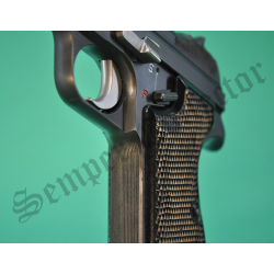 - Bei dieser P 210-6 „Precosse“ mit der Nummer P58095 für dieses Modell von 1955/56 ist die Abzugsbügelplatte seitlich an das ursprüngliche Fabrikgehäuse geschraubt und die betreffende Schraube wird vom linken Griff verdeckt,
