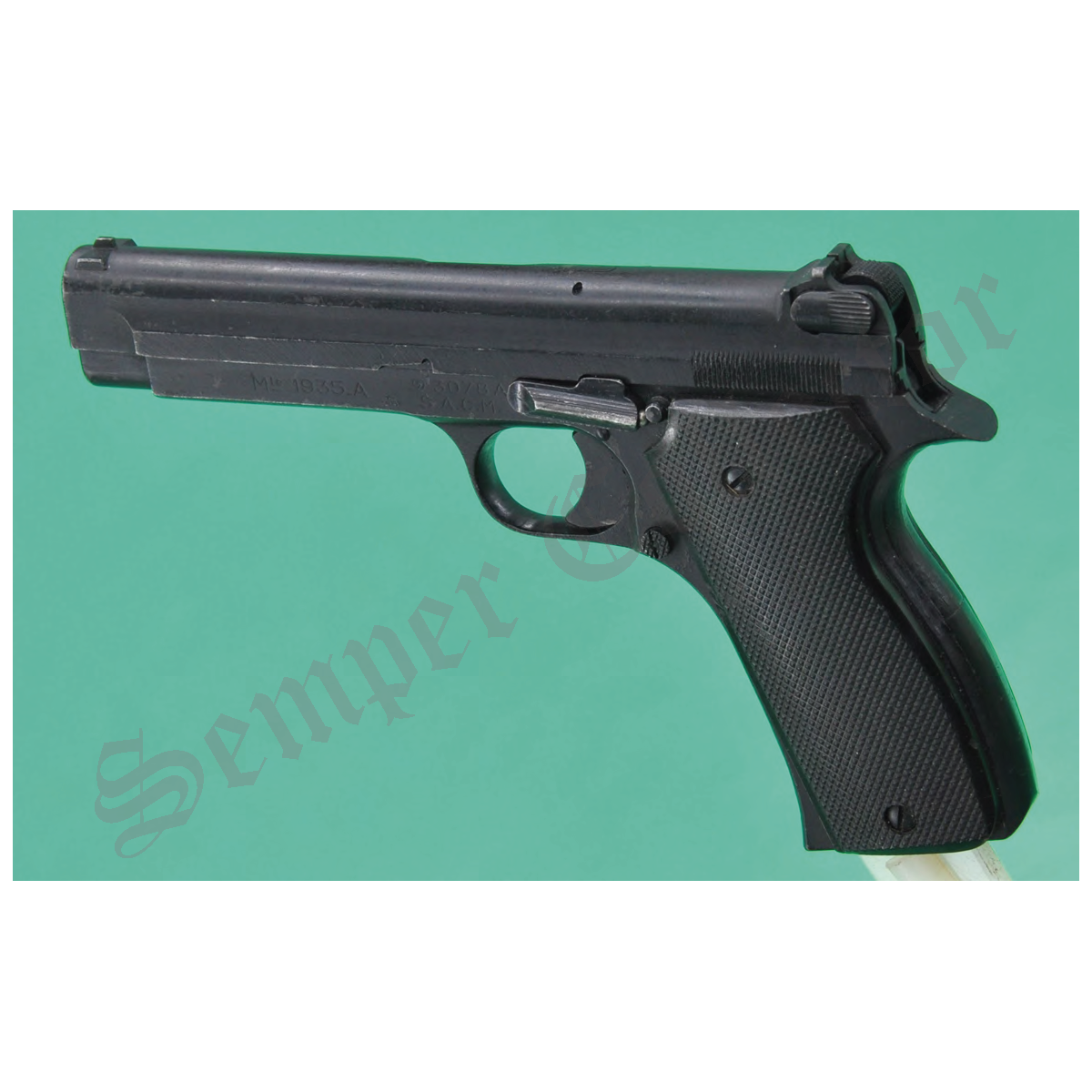 Under the designation “Pistole 625(f)”, this pistol belongs to the SACM 1935A pistols produced under German occupation and accepted by the Wehrmacht (Waffenamt WaA251).